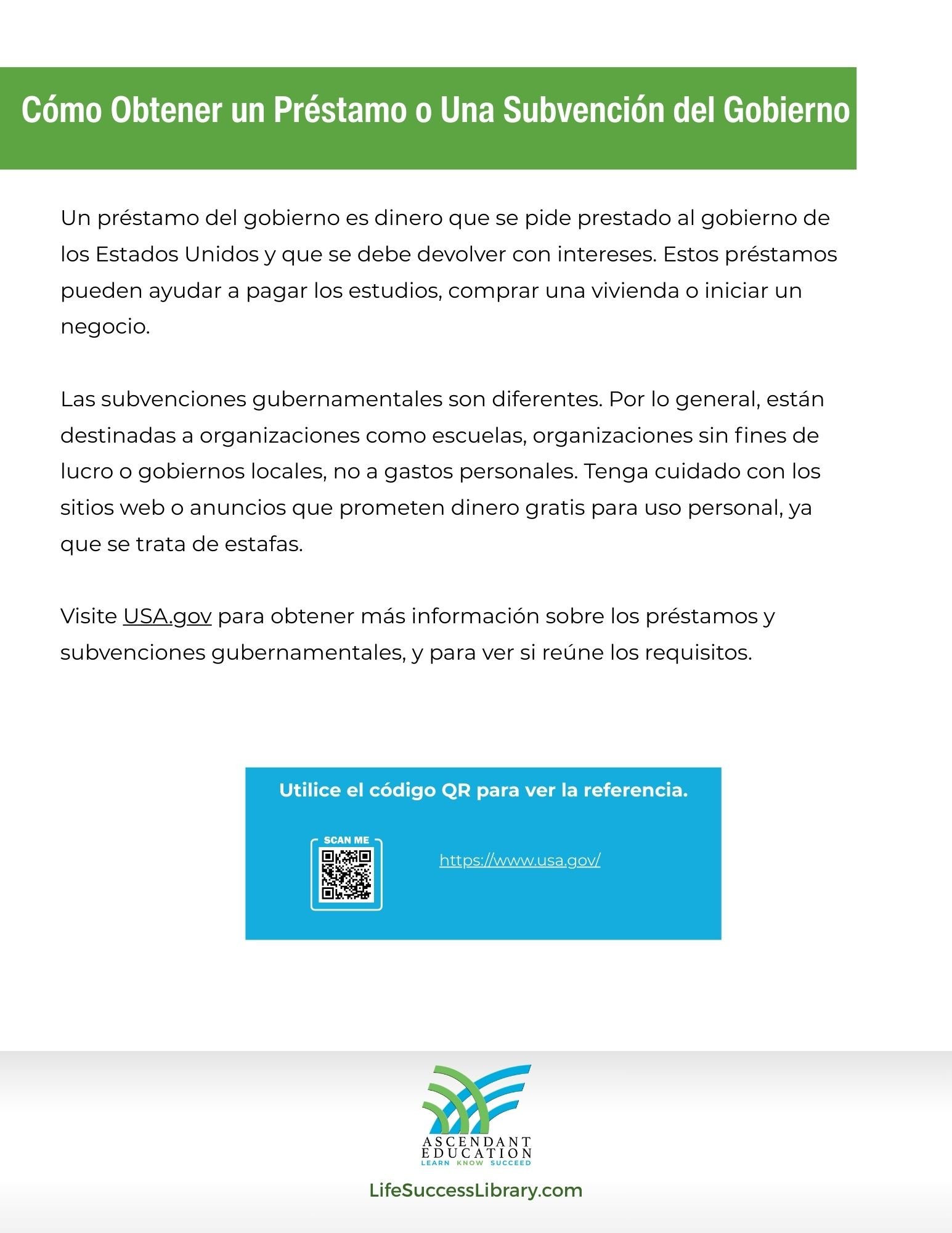 Un préstamo del gobierno es dinero que se pide prestado al gobierno de los Estados Unidos y que se debe devolver con intereses. Estos préstamos pueden ayudar a pagar los estudios, comprar una vivienda o iniciar un negocio.