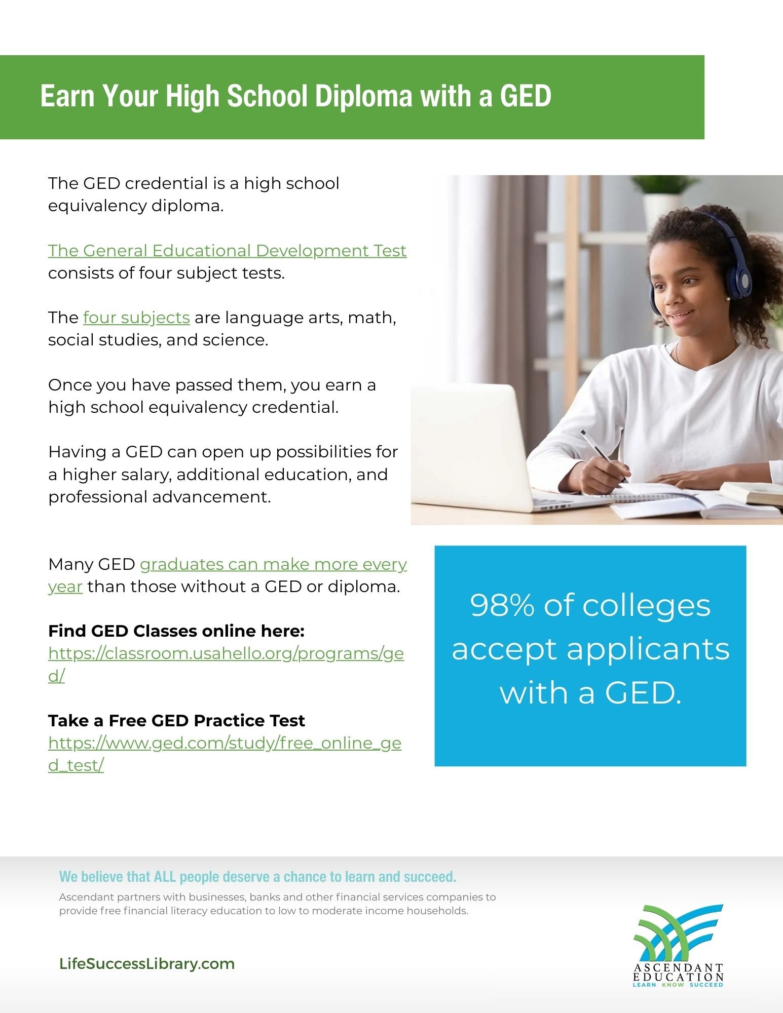 Having a GED can open up possibilities for a higher salary, additional education, and professional advancement.
