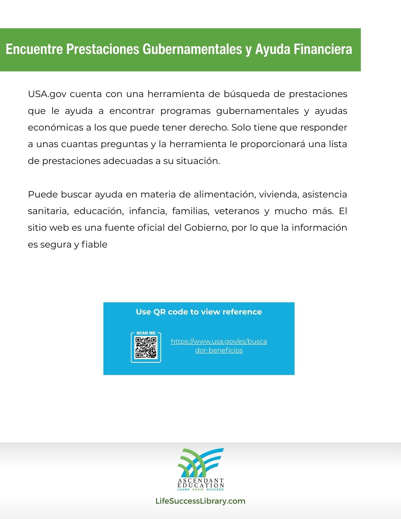 Puede buscar ayuda en materia de alimentación, vivienda, asistencia sanitaria, educación, infancia, familias, veteranos y mucho más. El sitio web es una fuente oficial del Gobierno, por lo que la información es segura y fiable.
