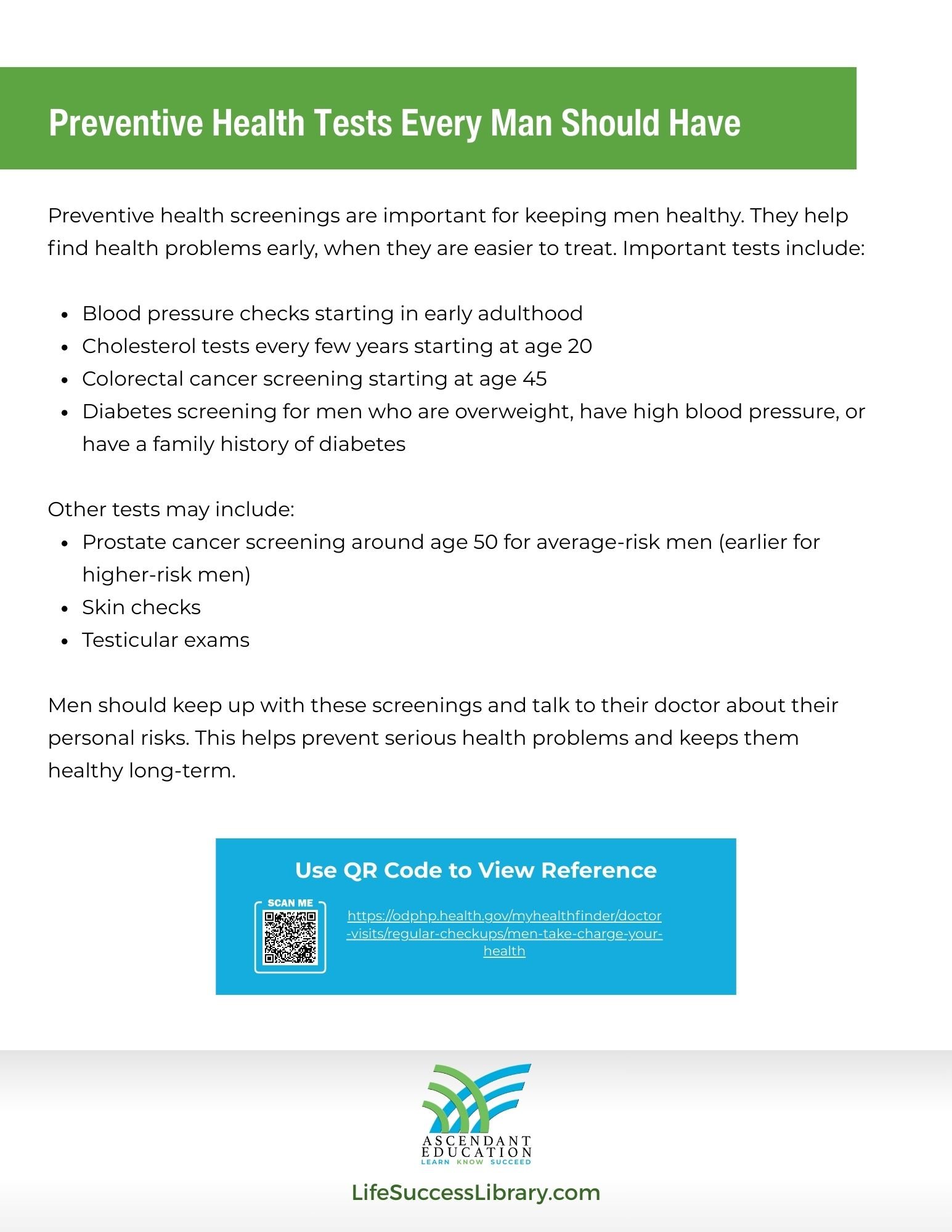 Men should keep up with these screenings and talk to their doctor about their personal risks. This helps prevent serious health problems and keeps them healthy long-term.