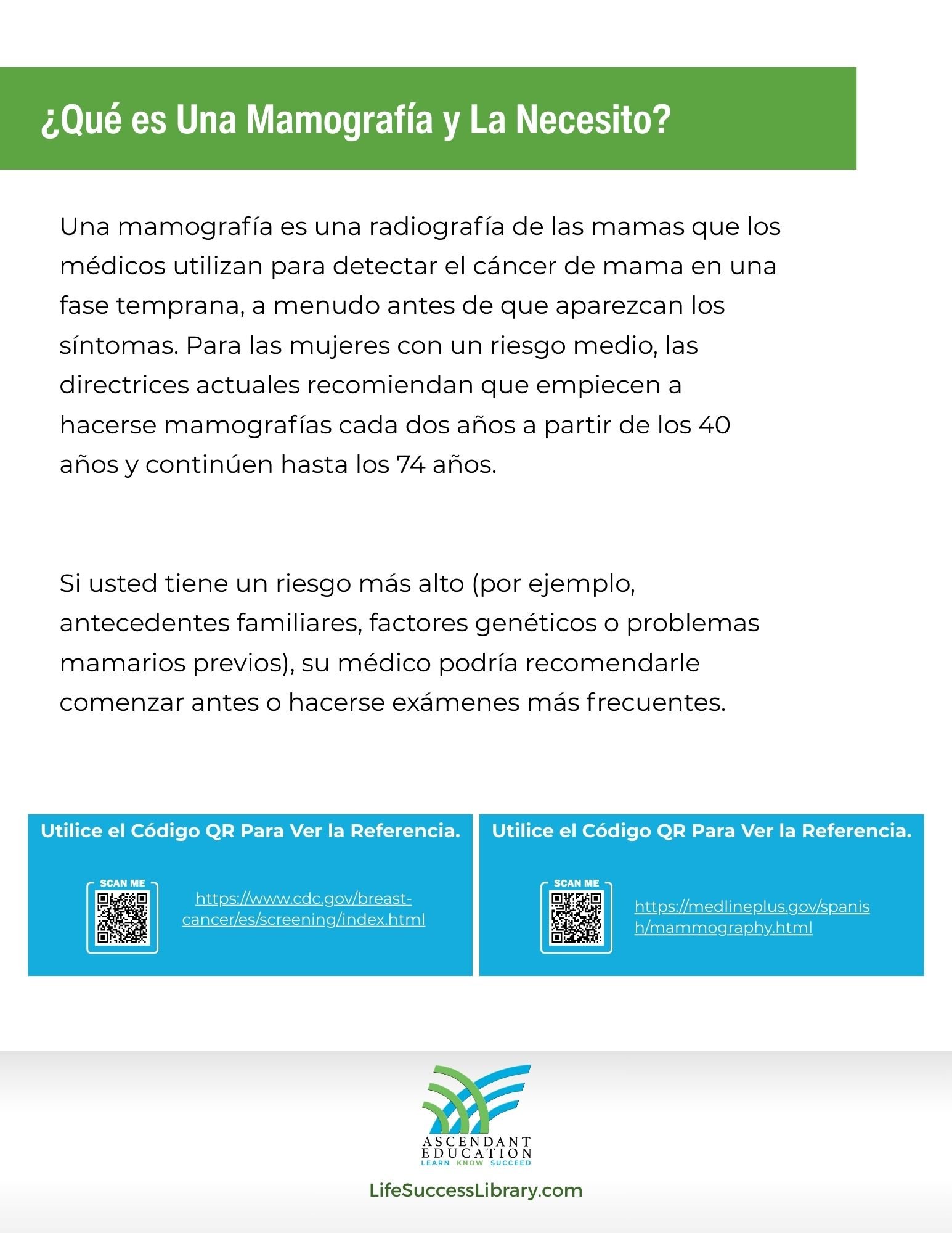 Una mamografía es una radiografía de las mamas que los médicos utilizan para detectar el cáncer de mama en una fase temprana, a menudo antes de que aparezcan los síntomas. Para las mujeres con un riesgo medio, las directrices actuales recomiendan que empiecen a hacerse mamografías cada dos años a partir de los 40 años y continúen hasta los 74 años.