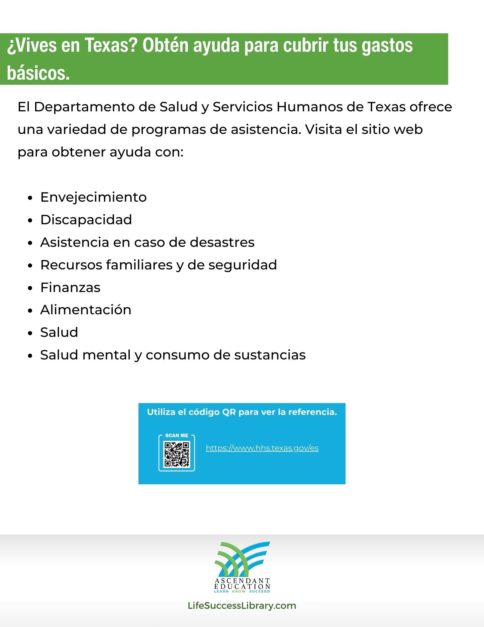 El Departamento de Salud y Servicios Humanos de Texas ofrece una variedad de programas de asistencia. Visita el sitio web para obtener ayuda con: