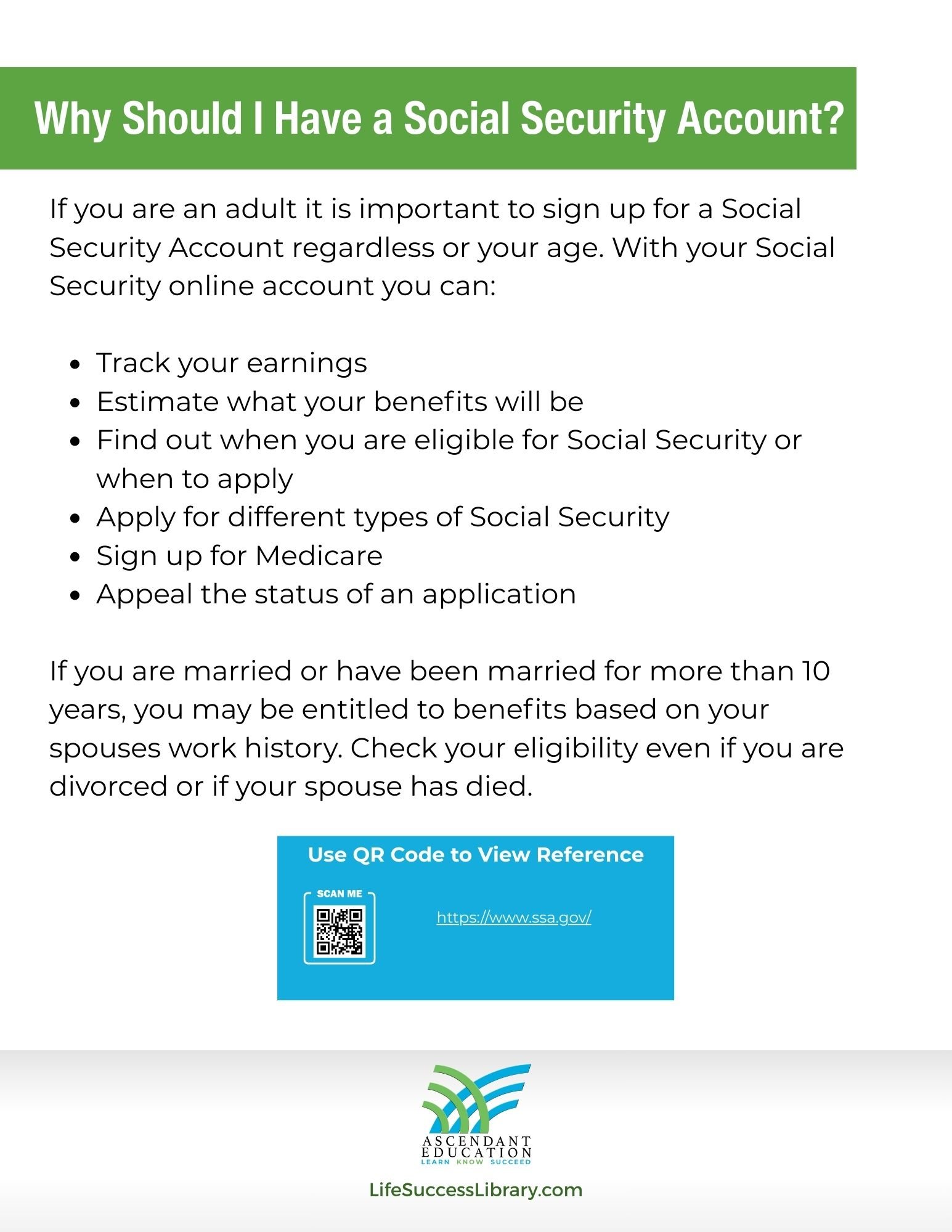 If you are married or have been married for more than 10 years, you may be entitled to benefits based on your spouses work history. Check your eligibility even if you are divorced or if your spouse has died.